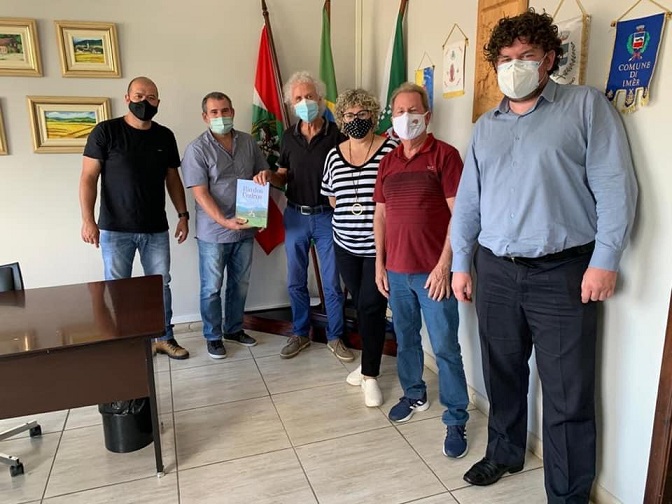 Despedida de Renzo no gabinete do prefeito de Rio dos Cedros/SC - 08/03/2021. Da esquerda para a direita: Rafael Nones (vice-prefeito), Jorge Stolf (prefeito), Renzo Grosselli, Giovana Lenzi (Diretora de Turismo e Cultura), Jaime Visentainer e Andrey José Taffner Fraga (presidente e vice-presidente do Circolo Trentino).